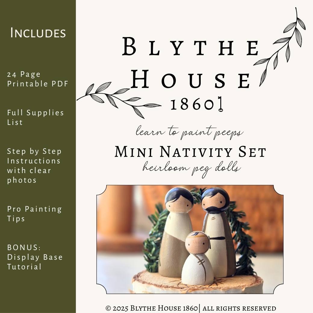 Paint your own Heirloom Mini Nativity Set with wooden peg dolls. This downloadable and printable PDF pattern is 24 pages packed with photos, instructions, tips, and supply list, so that even a beginner can paint this classic Christmas Tradition.